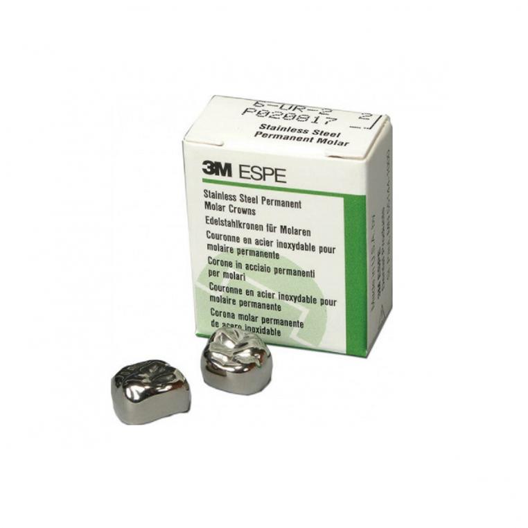 These prefabricated stainless steel crowns are manufactured with life-like height, contour and occlusal surface. They are pre-crimped at the cervical margin for fast and easy placement. Refills of individual primary molar crowns are available in boxes of five. Benefits -Easy to customize. -Shallow occlusal anatomy means less tooth reduction. -Thick occlusal surface to prevent bite-through. -Parallel walls allow for operator fit control. -Pre-trimmed to optimum length and contour to save placement time. -Available in molar styles to meet your adult patient needs. -Crown set is packaged in a unique, stackable tray that provides convenient, easy storage of 3M™ ESPE™ prefabricated crowns. -Wide array of shapes and sizes. -Made in the U.S.A. -High quality stainless steel.