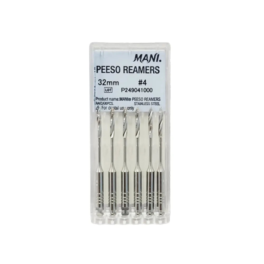 The Mani Peeso Reamer No.6 is a high-precision endodontic instrument designed for enlarging and paralleling the coronal portion of root canals, particularly useful in post-core preparations. Manufactured in Japan, it is crafted from hard fiber stainless steel, ensuring durability and resistance to corrosion from various sterilization methods, including autoclaving and chemical vapor.